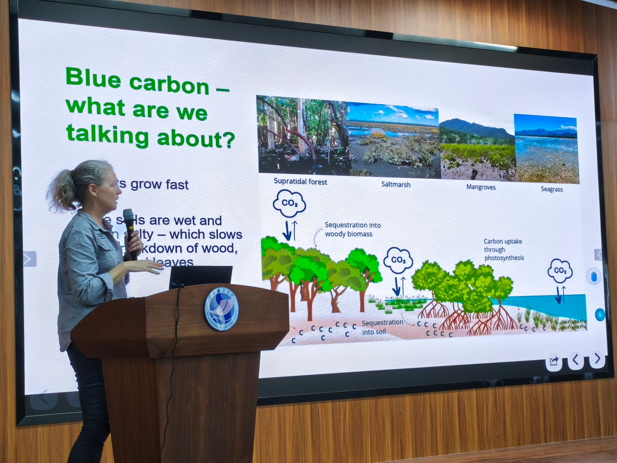 Sunil Kadri教授以“查尔斯·达尔文大学水产养殖研究”为题作报告,系统介绍了该校在热带水产养殖、深海工程、精准监测、环境保护评估等领域的研究方向与特色,并分享了海洋物种保护与渔业转型升级等方面的最新进展。随后,格鲁特水产原住民公司(GAAC)总经理和主席围绕“打造格鲁特岛蓝色经济”作联合汇报,介绍了依托澳大利亚北领地区格鲁特岛资源优势,推动海洋产业发展、水产养殖产业提升和社区经济振兴的实践探索。Rachel Groom博士以“北领地蓝碳市场发展:机遇、伙伴关系与路径”为题作报告,介绍了融合生态学、空间科学、政策制定与社区参与的研究与实践路径,阐述了应对热带沿海系统复杂环境挑战的思路与举措。