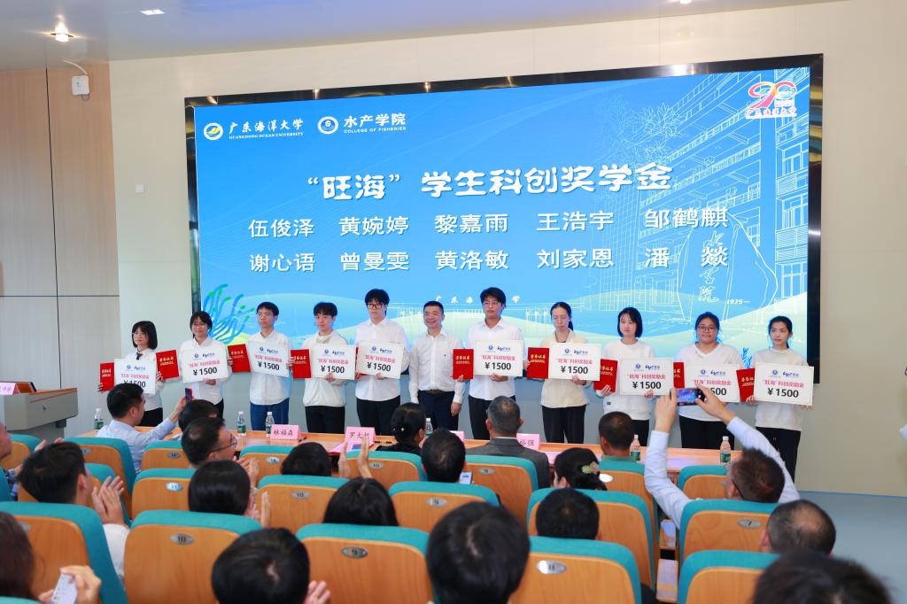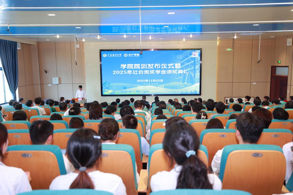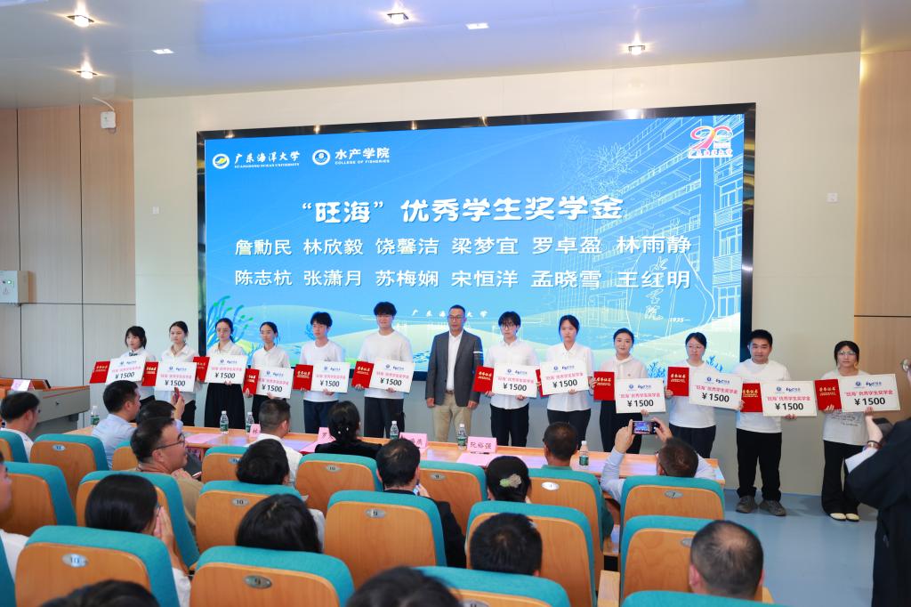 九秩传承蓝海志,风华正茂启新程。11月22日,时值广东海洋大学九十周年校庆日,水产学院在湖光校区举行2025年社会类奖学金颁奖典礼暨优秀校友企业家代表经验分享会。学院党委书记王海燕、院长罗大极、党委副书记孔沛球,广东旺海生物科技集团股份有限公司总裁、优秀校友阮裕强先生,广东利洋水产科技股份有限公司经理、优秀校友林福森先生以及校友、教师和学生代表等200余人齐聚一堂,共同见证这一以育人成果献礼母校华诞的温馨时刻。活动由孔沛球主持。
