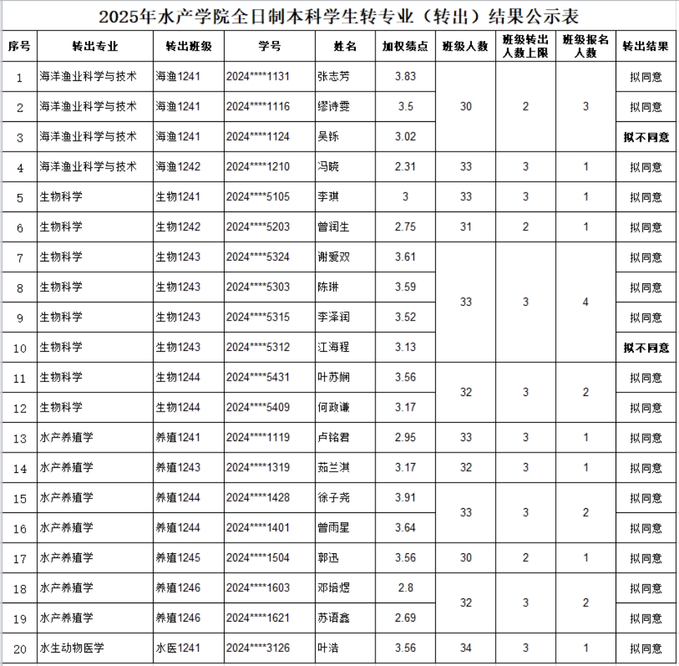 附表:2025年水产学院全日制本科学生转专业(转出)结果公示表