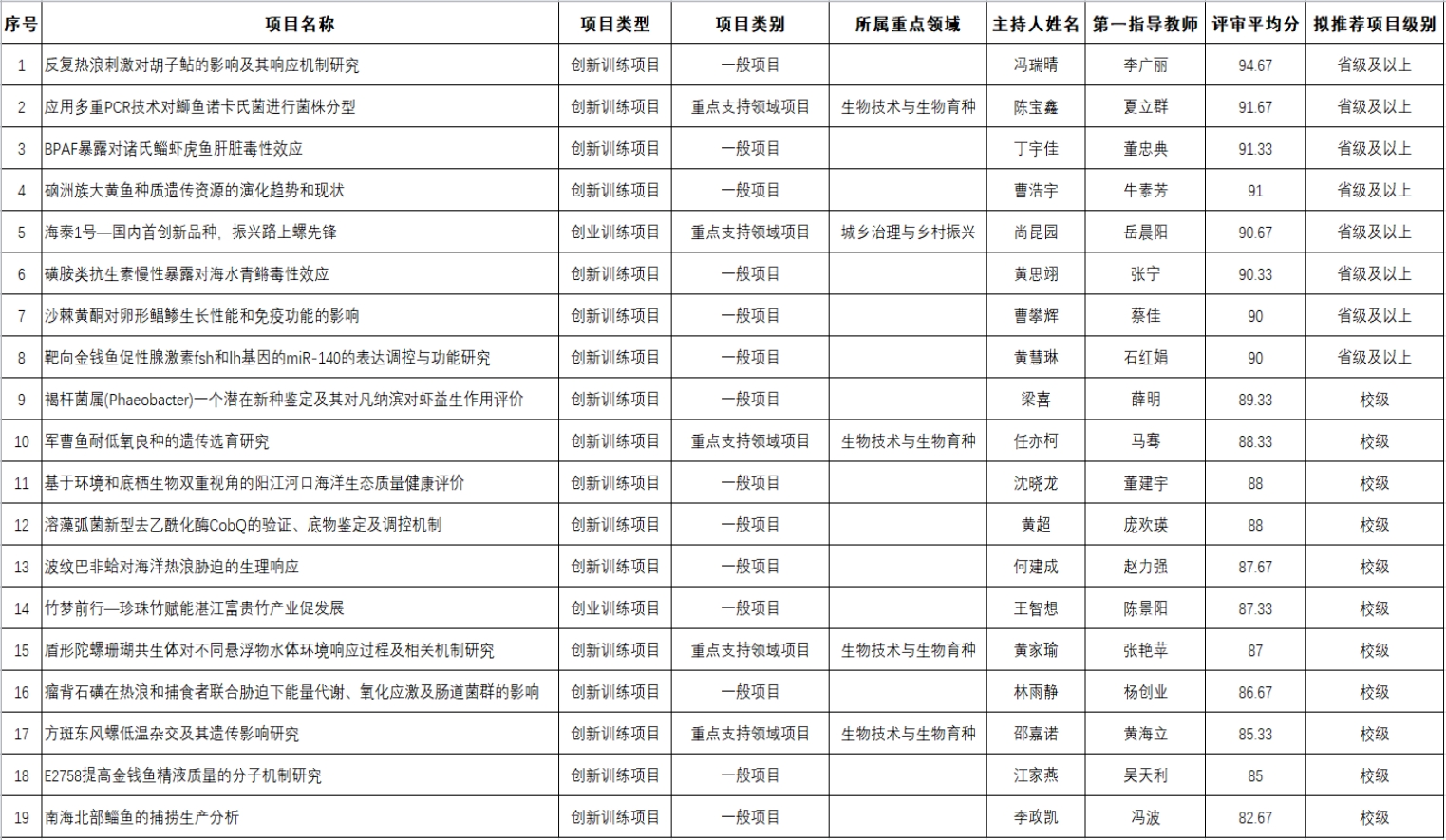 根据学校《印发广东海洋大学大学生创新创业训练计划项目管理办法》(校教务〔2012〕38号)、《关于做好2024年大学生创新创业训练计划项目申报和结题验收工作的通知》(校〔2024〕16号)文件精神及要求,我院组织开展2024年大学生创新创业训练计划项目申报工作。经学生申报、导师审核、学院进行资格核查,共有19项符合申报条件。经专家对所申报项目进行评审,并根据《关于做好2024年大学生创新创业训练计划项目申报和结题验收工作的通知》中附件6(各学院2024年大创项目限额表),我院拟推荐项目数为19项(其中,省级及以上8项,校级11项)。根据评分从高到低排序,现将拟推荐项目公示(详见附表)。