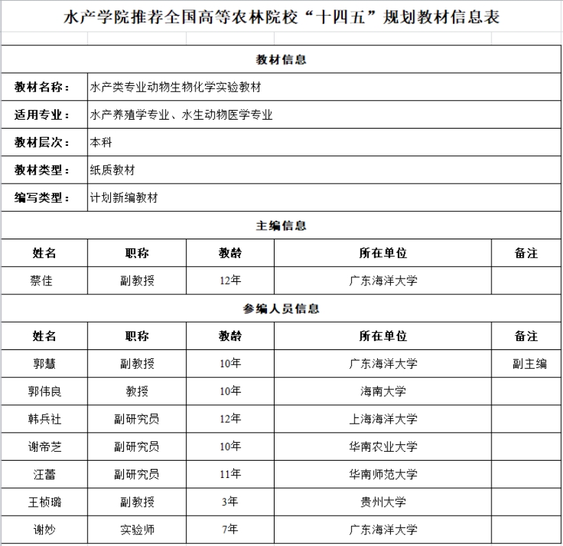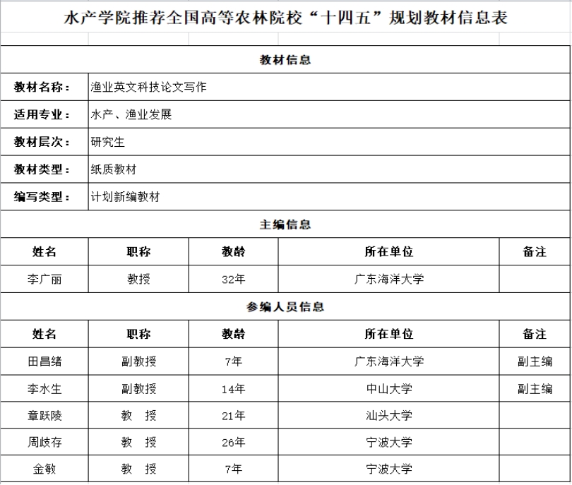 经个人申报、学院审核及学院党政联席会议研究决定,现拟推荐《渔业英文科技论文写作》《水产类专业动物生物化学实验教材》申报全国高等农林院校“十四五”规划教材,相关信息详见附表。现予以公示。