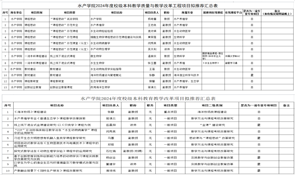 附表1:水产学院2024年度校级本科教学质量与教学改革工程项目拟推荐汇总表