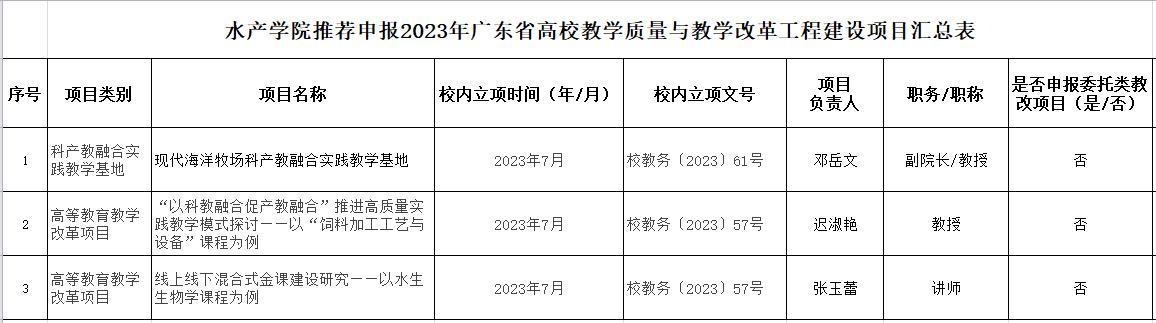 附表:水产学院推荐申报2023年广东省高校教学质量与教学改革工程建设项目汇总表