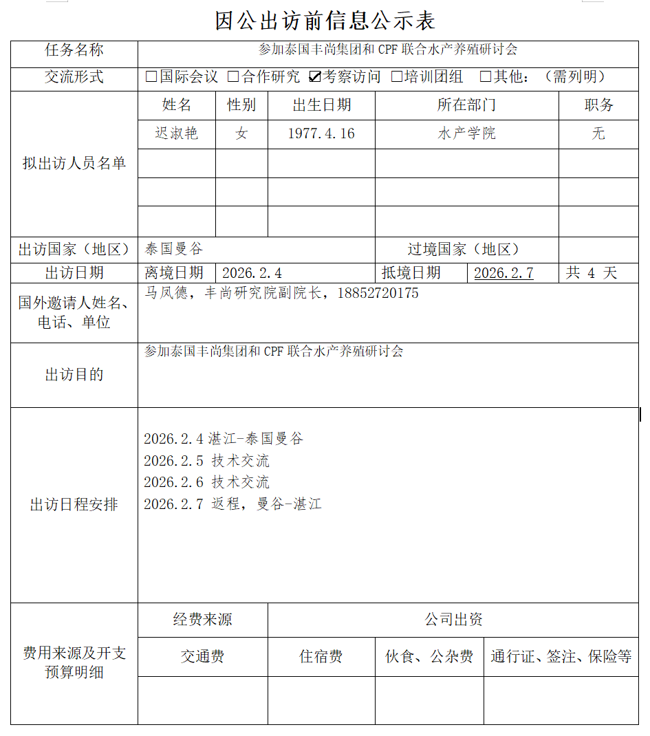 根据《关于进一步规范省部级以下国家工作人员因公临时出国的意见》的要求,现将广东海洋大学因公出访信息予以公示(详见附件)。公示时间为2026年1月29日至2月3日。如有意见,请在公示期内,向相关单位反映。