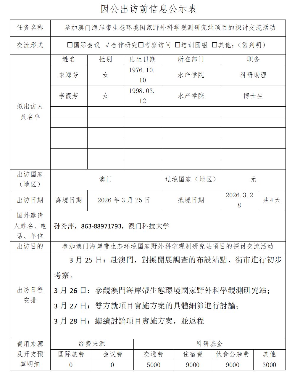 根据《关于进一步规范省部级以下国家工作人员因公临时出国的意见》的要求,现将广东海洋大学因公出访信息予以公示(详见附件)。公示时间为2026年3月18日至3月22日。如有意见,请在公示期内,向相关单位反映。