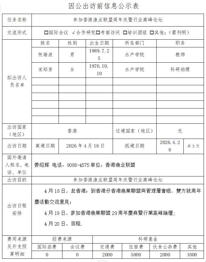 根据《关于进一步规范省部级以下国家工作人员因公临时出国的意见》的要求,现将广东海洋大学因公出访信息予以公示(详见附件)。公示时间为2026年4月10日至4月16日。如有意见,请在公示期内,向相关单位反映。