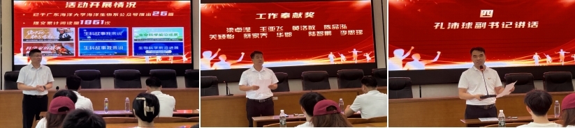 会上,田昌绪在对活动进行总结时强调,在为期一个月的活动中,共有51位同学积极参与,他们自主收集素材,共完成了131篇课程思政推文,其中26篇推文已在广东海洋大学海洋生物系公众号上发布,累计阅读量达到1861次,充分展现了活动的广泛参与度和积极效果。陈景阳随后宣读了获奖名单后,获奖者们依次上台领取荣誉证书和奖品,他们的努力赢得了与会人员的热烈掌声。孔沛球在总结发言中对本次活动给予了肯定,并鼓励学生们继续在学术道路上坚守学术诚信,追求卓越,积极参与学院的各项教育教学活动,共同推动学院的学风建设和思政工作再上新台阶。