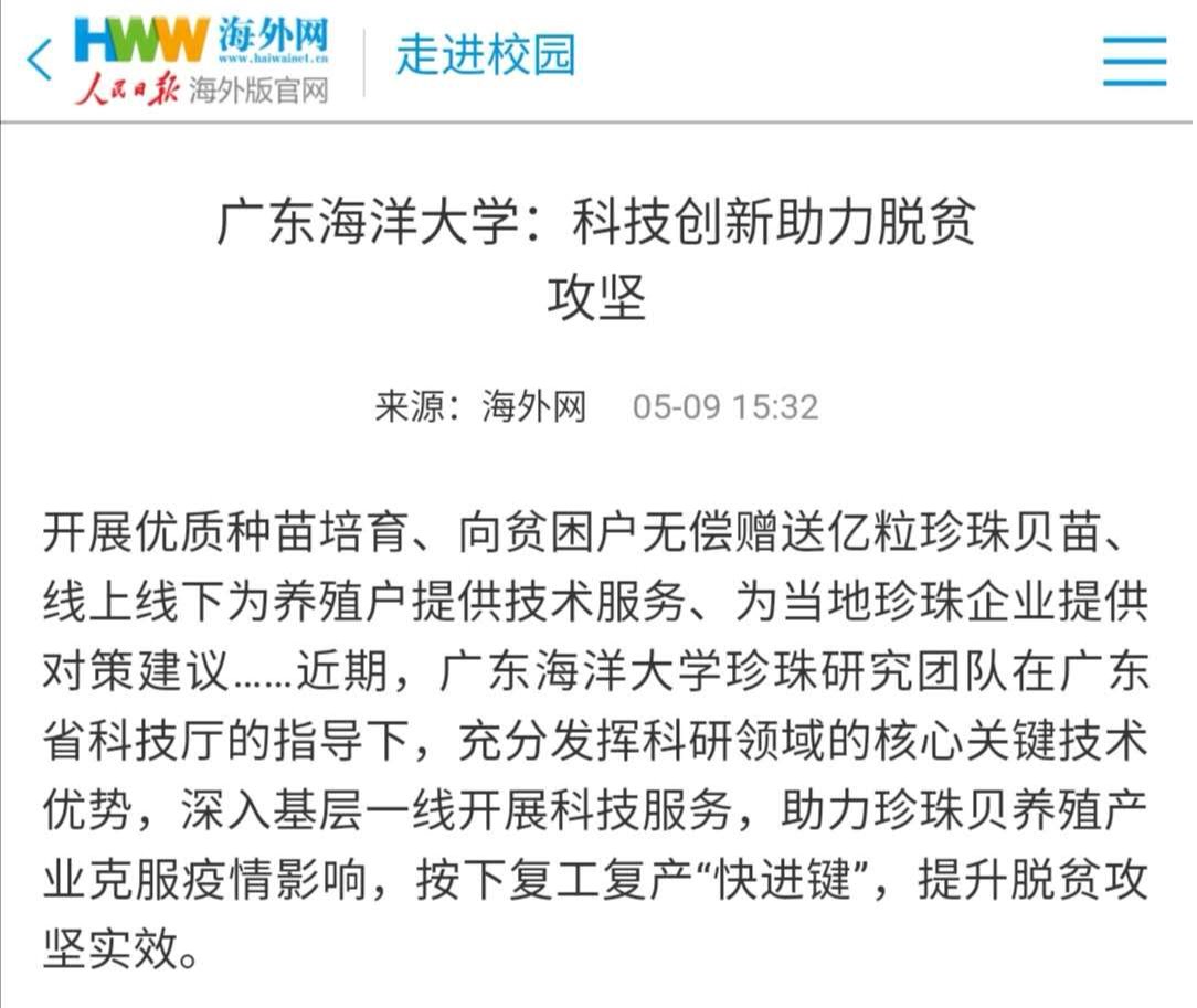 近日,人民日报海外版官网以《广东海洋大学:科技创新助力脱贫攻坚》为题,南方+广东教育头条以《100000000粒珍珠贝苗!无偿赠送!》为题,对我校珍珠研究团队科技创新助力脱贫攻坚和乡村振兴先进事迹进行了深度报道。其中南方+广东教育头条刊发的新闻报道入选南方+平台“首页收录”和“热文榜五十佳”。